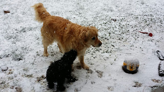 It snowed enough so that school was cancelled. The girls were really happy to be able to stay home and play in the snow.